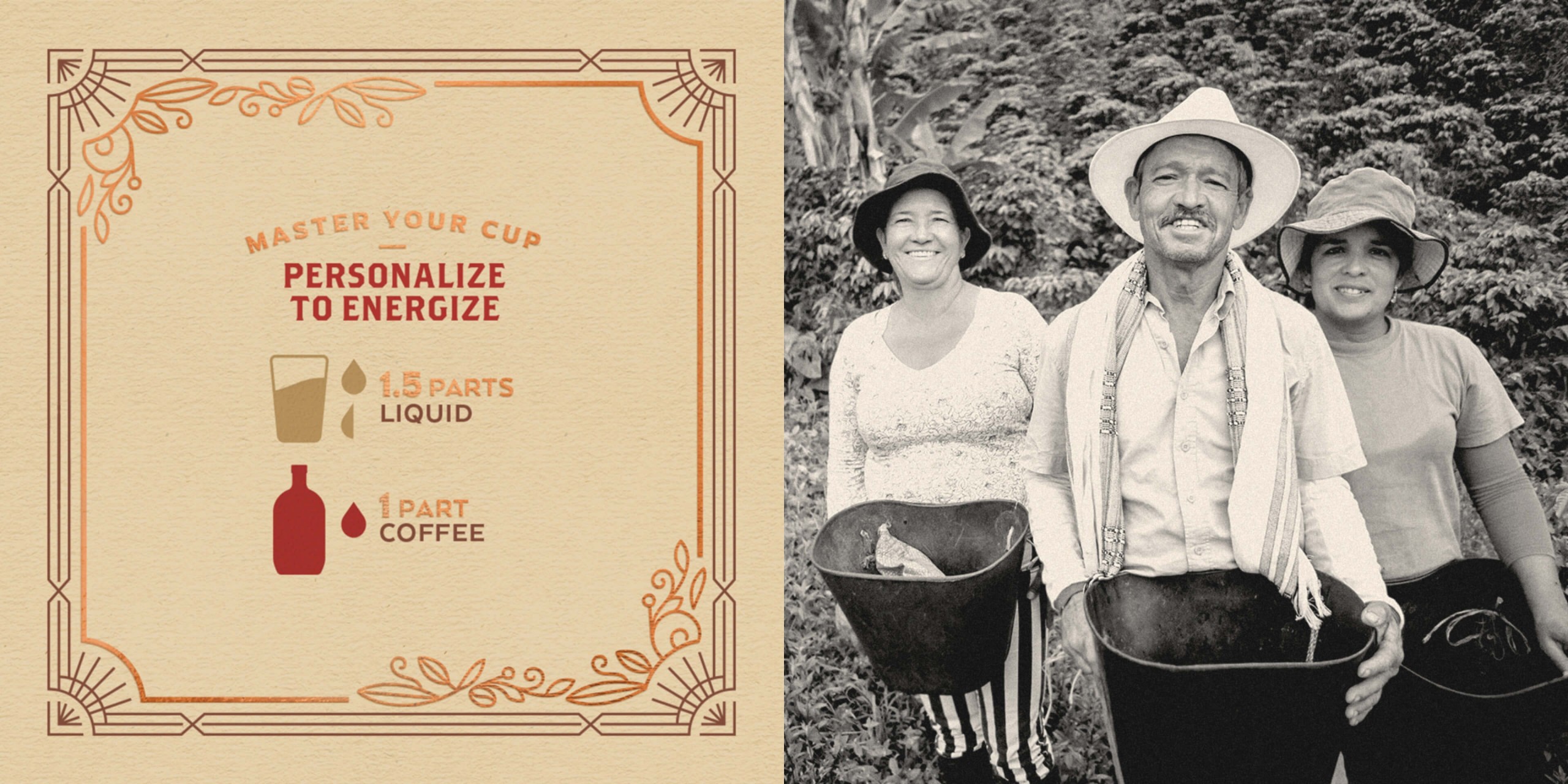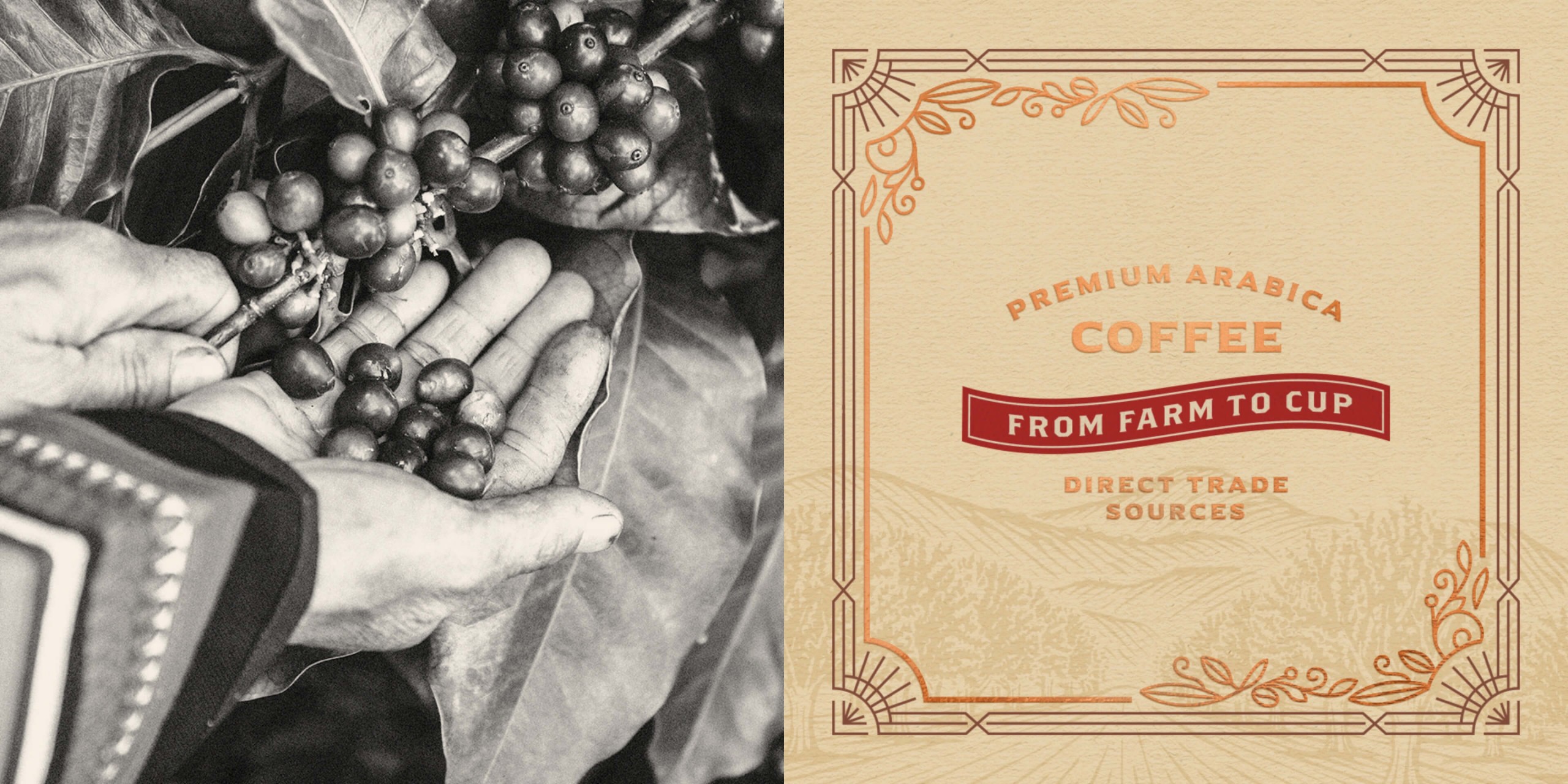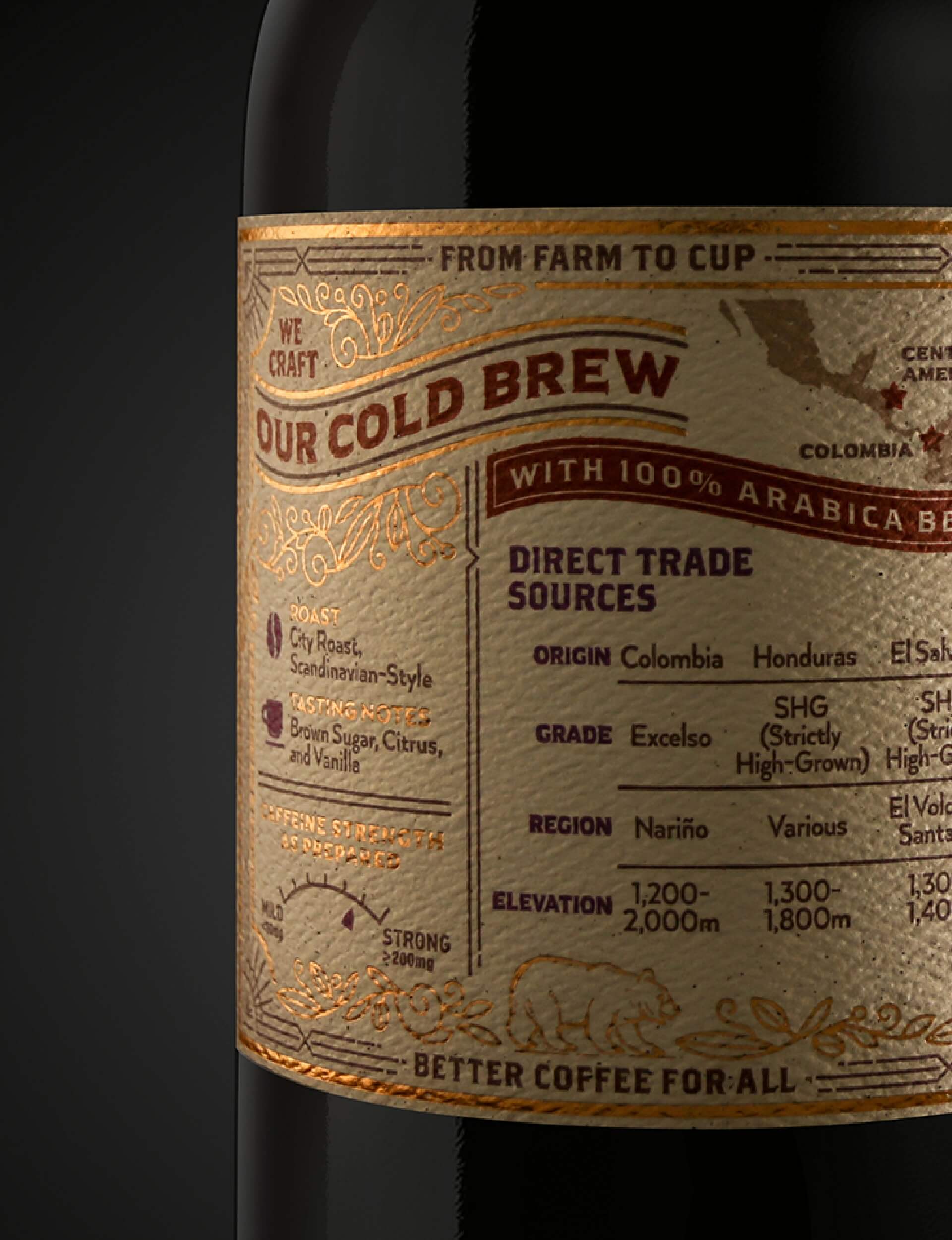 The overall label richly conveys the sourcing story through crafted illustrations, intricate embellishments and copper foil accents. The final glass bottle finishes include: embossed logo and brand messaging along with a copper cap to top it off.