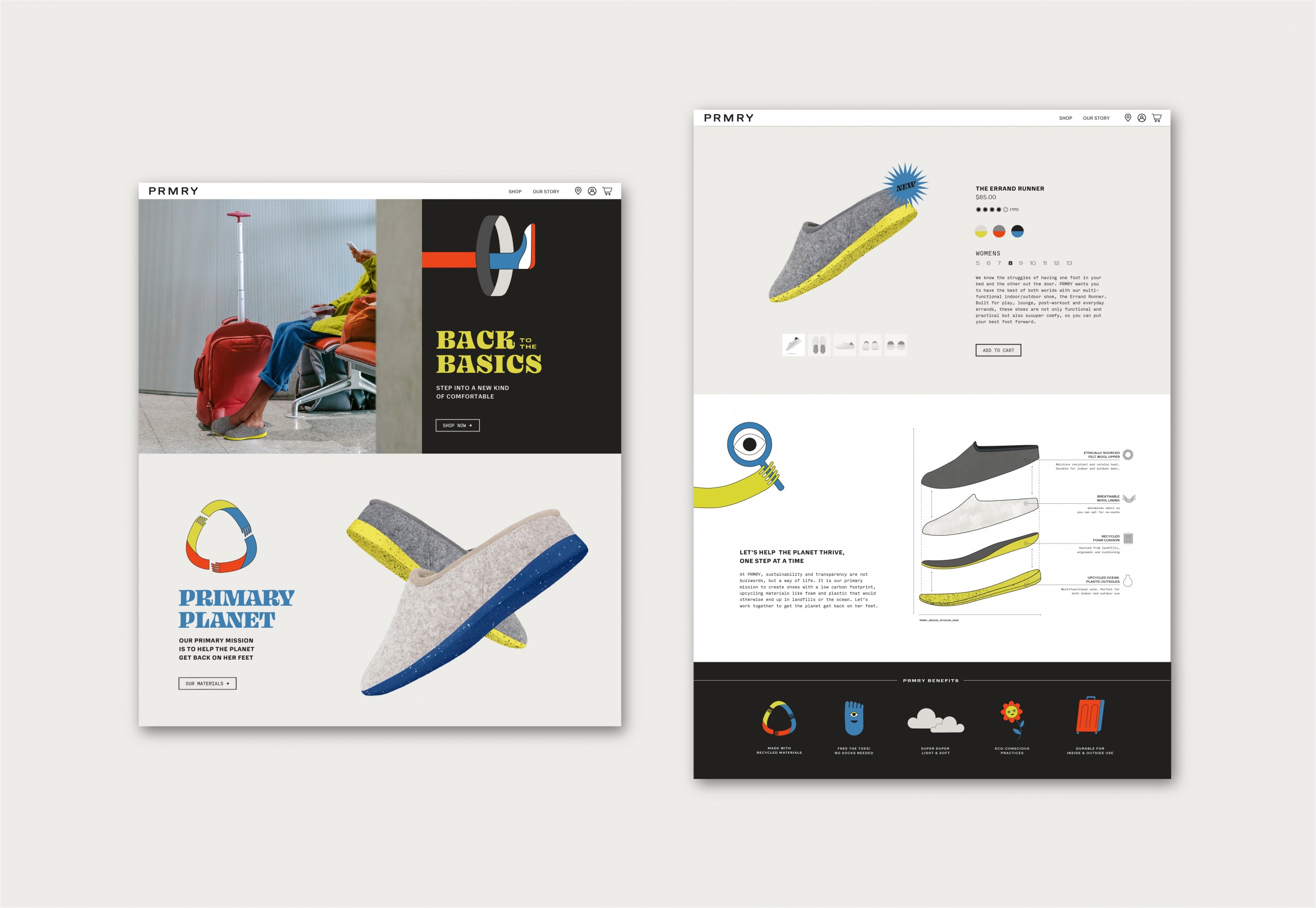 Farm was approached by PRMRY with a vision—to create a lifestyle brand for their premium footwear product. Their proprietary shoe design is comfortable, versatile for both indoor and outdoor wear, and most importantly, low impact on the environment. Farm was tasked with strategizing the name, visual identity and personality for the brand that would appeal to the socially eco-conscious youth.